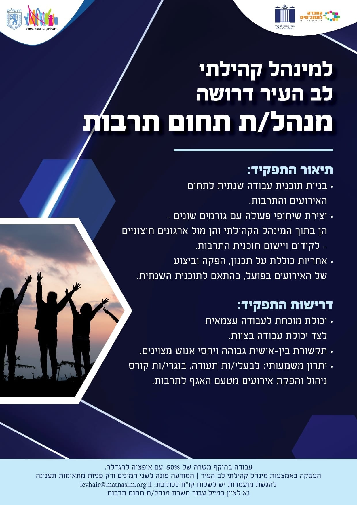 העסקה באמצעות מנהל קהילתי לב העיר בהיקף משרה של 50%, עם אופציה להגדלה. להגשת מועמדות יש לשלוח קו"ח